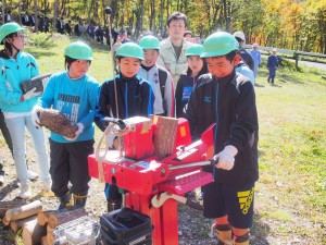 運び出した薪は、子供たちがエンジン式の薪割機を使ったり、スプリッターと言う手動のものを使い小割に