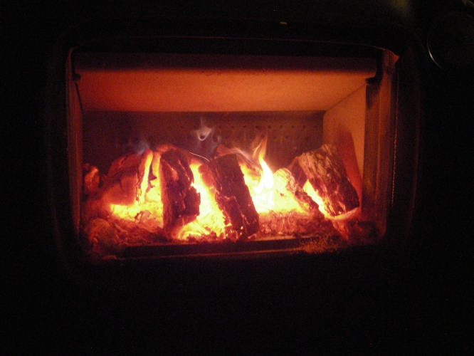 ショールームで焚いている ヨツール F305 オプションで天板にソープストーンをのせています。