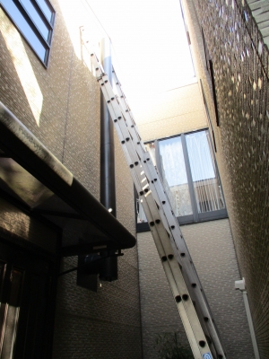 前回の工事から、1日開けての作業 足場が無いので梯子を2本立てての作業です。