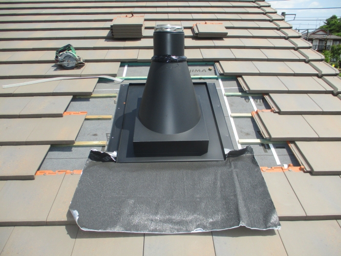 煙突周りだけを残して瓦が葺きあがっています。 瓦屋根用ボックスフラッシング