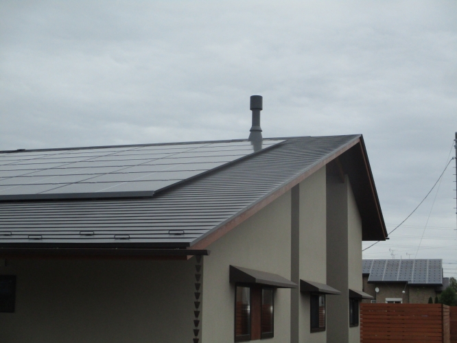 屋根にはソーラーパネルが設置されていました。 煙突