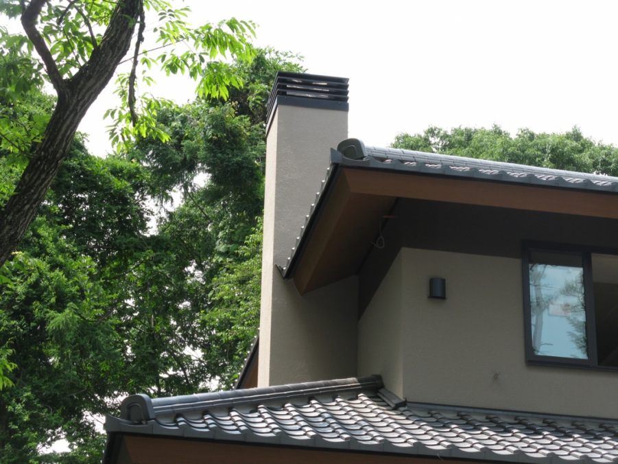 外の煙突は、左横の屋根が邪魔をしてまっすぐ上がらないので、