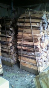 腰高までかさ上げした箱に薪を入れて露天雨ざらしの