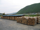 山から切り出された原木が積み上げられています。