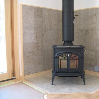 茨城県での薪ストーブ設置工事 本体設置です。 薪ストーブ本体は バーモントキャスティ